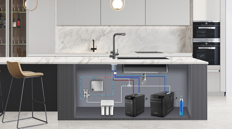 Elevate your home with this sleek Wintemp Under-Counter Water System, designed for modern kitchens that value both functionality and aesthetics. This integrated system combines a tankless electric water heater, advanced water filtration unit, and chiller, delivering purified hot and cold water on demand.