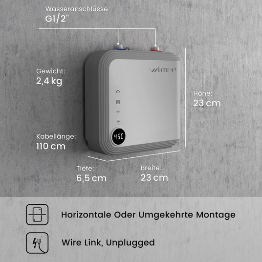 With G1/2" connections, it can be installed above or below sinks. Requires 230V, a 25-amp circuit breaker, and 2.5 mm² wiring. Weighs just 2.0 kg (23 cm x 23 cm x 6.5 cm).
