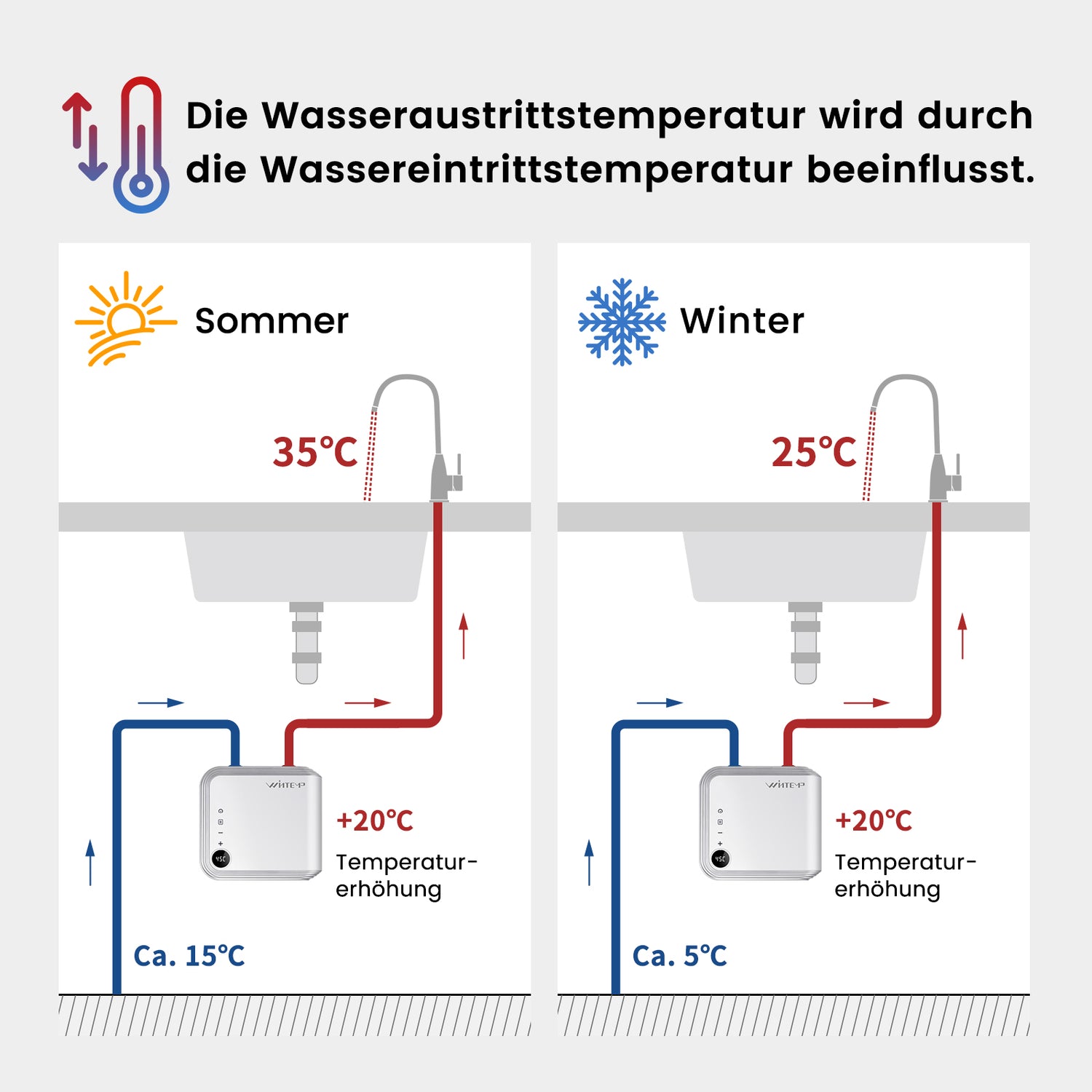 The KF55 provides hot water at 1.2 L/min (approx. 30°C) within seconds. With a temperature rise of 25 K, it can deliver up to 3.0 L/min – perfect for bathroom and kitchen sinks.